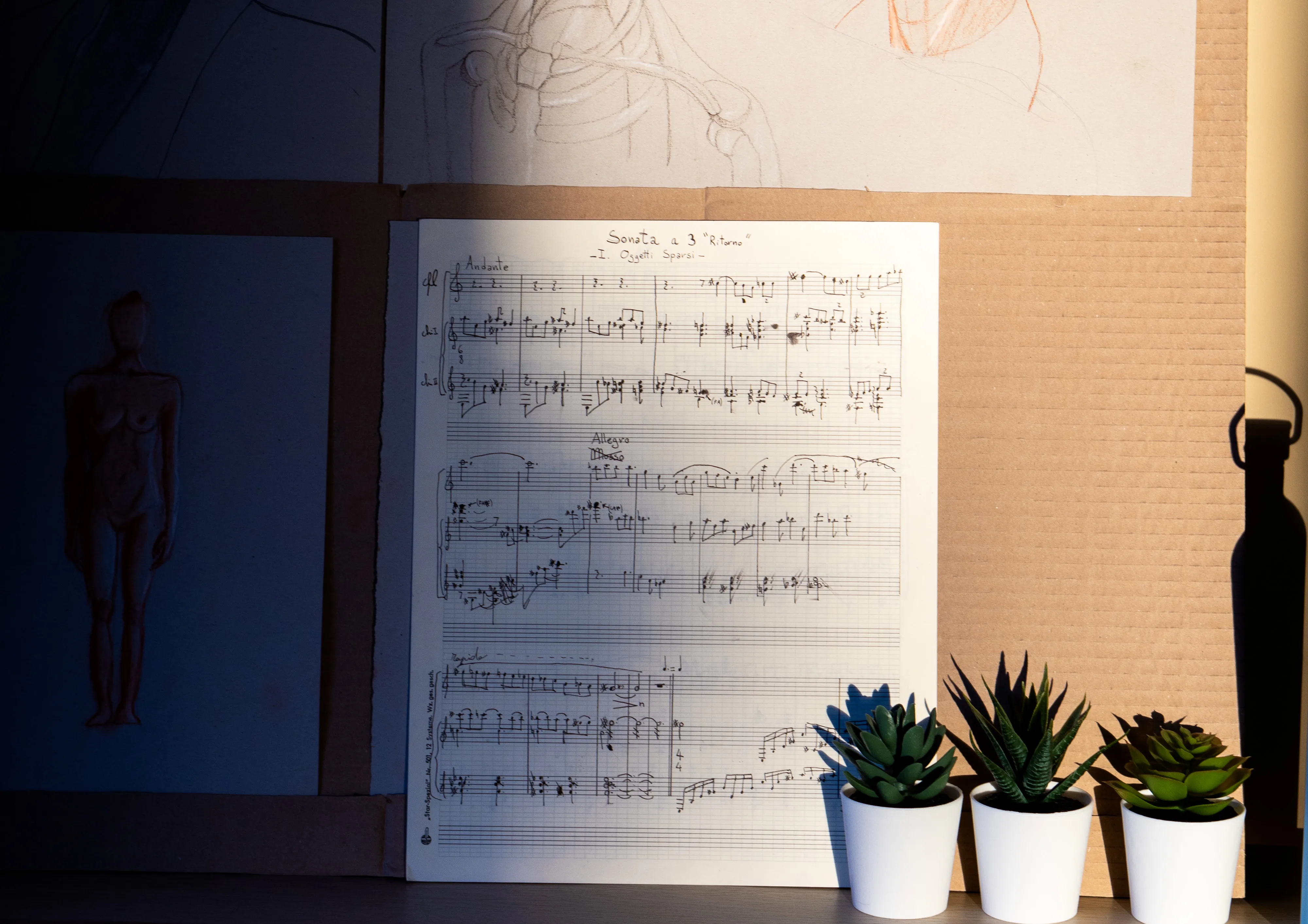 "Interludio per ritrovar sé stessi" is the fourt piece from Trasparenze, a collection of five works. Each piece represents a different emotion and the colors of guitar are used to express them deeply. In the book each piece is accompanied by an illustration.